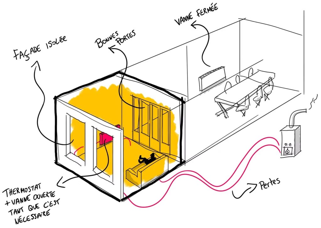 L’utilisation des radiateurs et des portes pour chauffer la pièce « salon »