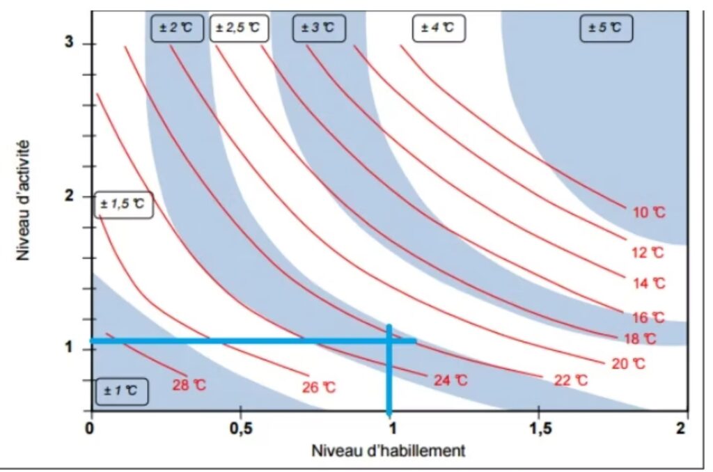 - Avec un habillement de 1Clo (jeans, chaussettes et pull moyen) et une activité de 1 MET (assis devant la télé), la température nécessaire sera probablement de 22°C (±2°C).