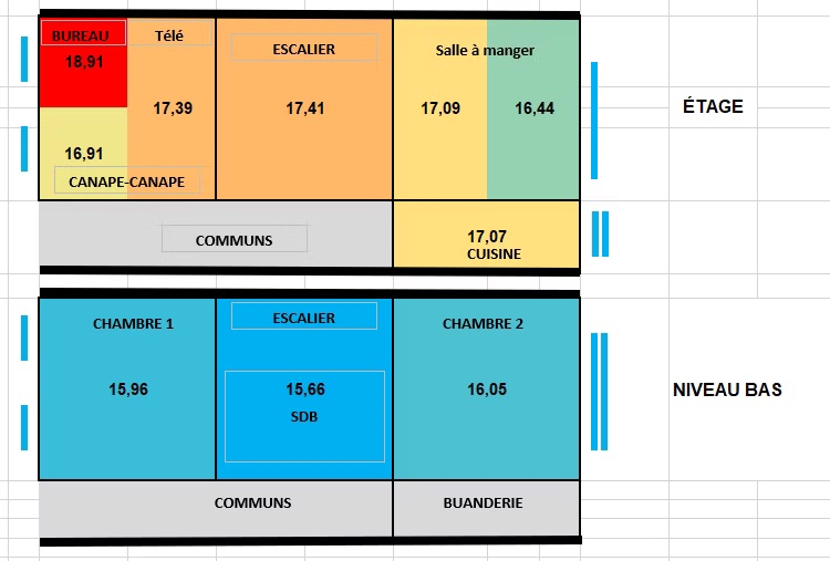 Ci après, un authentique exemple des variations de température dans un duplex non chauffé. On observe que le bureau est clairement à la bonne place. On observe également que si on veut avoir un peu plus chaud dans la salle à manger, mieux vaut s’éloigner la fenêtre ! La table de la salle à manger sera ici un bon « spot » pour le télétravail estival !