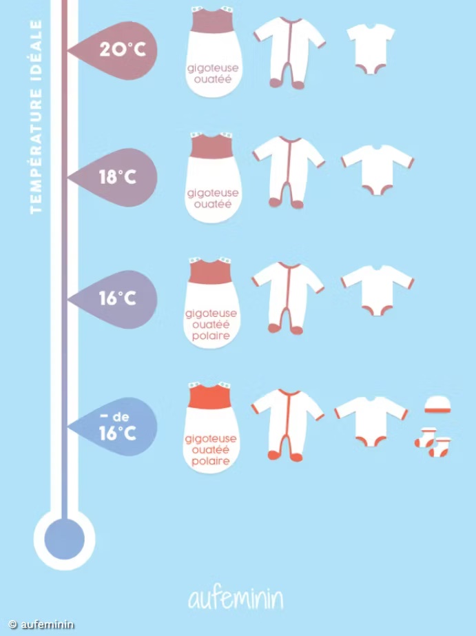 Comme pour un adulte, il n’est pas question de le mettre à dormir nu par 16°C. Il faut adapter l’habillement à la température. L’avantage d’une température basse est également de conserver un minimum d’humidité dans l’air et d’éviter la déshydratation du nouveau-né.