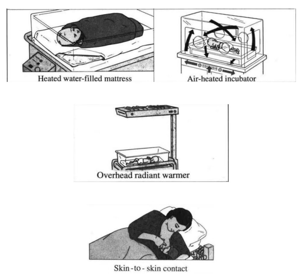 Parlant de nouveau-nés, il est également intéressant de voir qu’il n’est jamais venu à l’idée de quelqu’un de mettre un néonat dans une pièce à 30°C. Ce serait très énergivore et très inconfortable pour le personnel soignant. Donc, plutôt que de chauffer les murs et l’air de tout le monde on opte naturellement pour le chauffage des corps où et quand ils en ont besoin, avec diverses solutions (OMS).