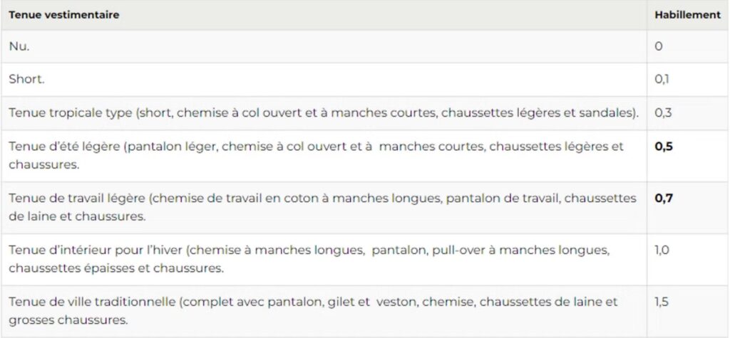 Le niveau d’isolation de l’habillement est caractérisé par une valeur, exprimée en “clo”, dont voici quelques valeurs indicatives partagées par le site énergie +.