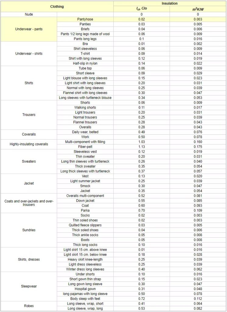 La liste, ci-après, permet de se faire une idée pour soi et d’optimiser son utilisation du vêtement. Elle est disponible sur: https://www.engineeringtoolbox.com/clo-clothing-thermal-insulation-d_732.html