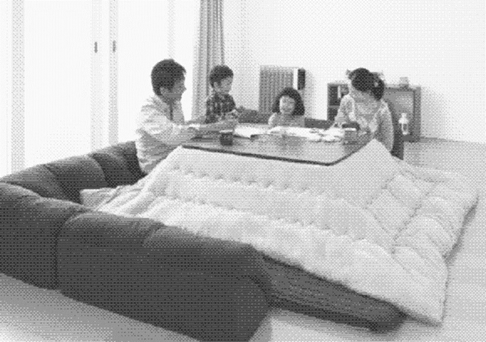 Le vêtement est un élément mais il existe une infinité de prolongations aux vêtements qui existent (plaids, écharpes, nappes tombantes, baldaquin…) ou qui doivent encore être inventés. Pour inspiration, voici les kotatsu japonais. Dans ce cas, la nappe est isolante, elle habille les convives et conserve la chaleur d’un petit chauffage d’appoint situé sous la table.
