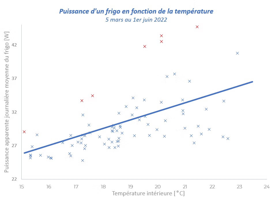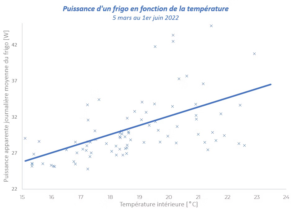 Une régression linéaire (la ligne bleue) nous permet de voir plus clair dans ce nuage de point et de comprendre la relation entre la température et la puissance que le frigo doit fournir. On observe ainsi une puissance moyenne de: